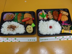 お任せ大人と子供弁当です。おかずは同じですが、ご飯や、付け合わせなどを変えて同じお値段でお届
